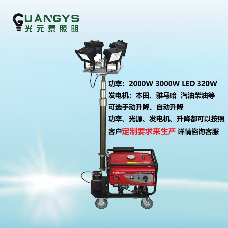 自带发电机,自动升降,光源采用双石英卤素灯。整套设备结构合理、操作方便。广泛应用于各种夜间作业如大型施工、工程抢修、灾情抢险、消防照明、警案现场、交通拯救、事故处理和广告拍摄等场合,满足了现场对大面积、高亮度照明的需求。