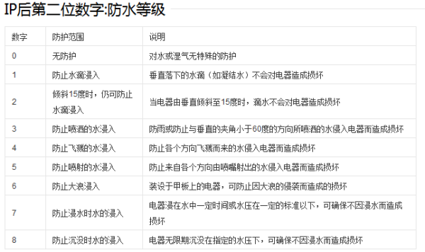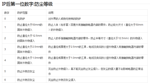 IP(INGRESS PROTECTION)防护等级系统是由IEC(INTERNATIONAL ELECTROTECHNICAL COMMISSION)所起草,将电器依其防尘防湿气之特性加以分级。这里所指的外物含工具,人的手指等均不可接触到电器内之带电部分,以免触电。IP防护等级是由两个数字所组成,第1个数字表示电器防尘、防止外物侵入的等级,第2个数字表示电器防湿气、防水侵入的密闭程度,数字越大表示其防护等级越高
